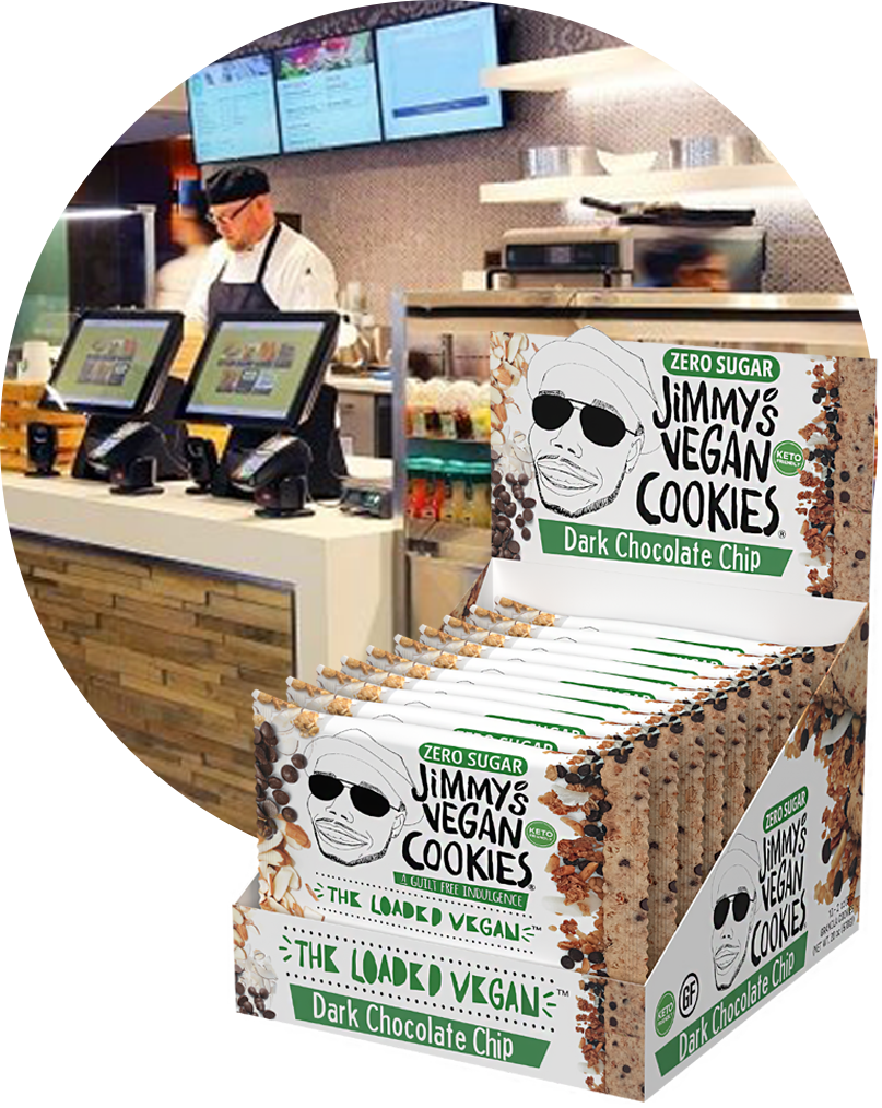 If your retail and dining operations have a POS (Point of Sale) system, we have Jimmy’s Vegan Zero Sugar Cookies On-The-Go, for your front store and check-out shoppers. We provide carton displays that are bold and visually distinctive for countertop impulse purchases.